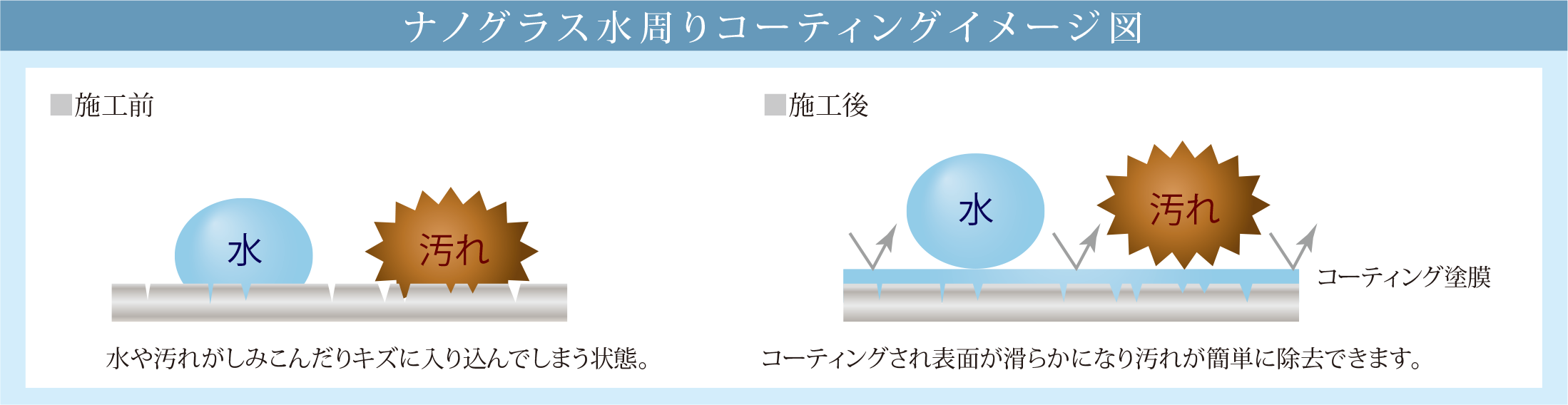 チタンと高純度シリカ化合物による塗膜が素材の目に見えない凹凸を埋め表面を滑らかにコーティングする事により汚れがつきにくく、落としやすくなります。