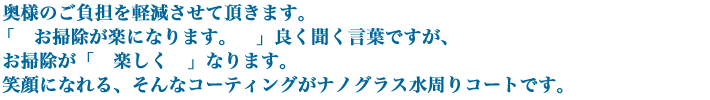 防汚効果・耐薬品性・紫外線抑制効果で日常のお掃除のストレスを軽減します。