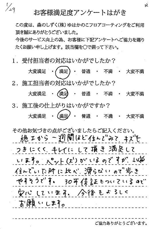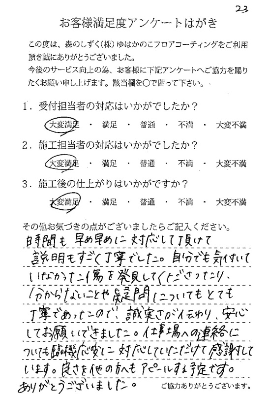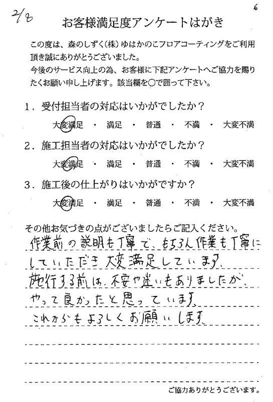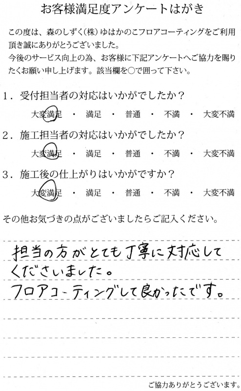 施工の方が、とても丁寧でした。施工後の床はすごくピカピカで綺麗でした。子供が今後床を、傷つけると思うのでフロアコーティングして良かったです!遠いところから来て頂きありがとうございました♪