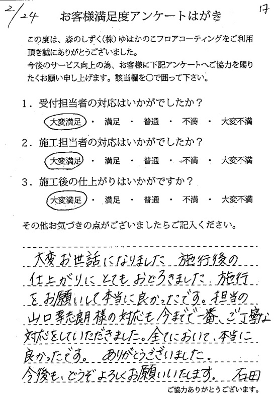 施工不良があり不安ななか施工前の説明や確認などしっかり行って頂き、こちらがきづかなかった床の状況なども気づいて頂き感謝致します。