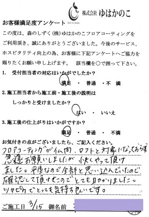 フロアコーティングが仏間、ロフトと対象になっておらず、急遽お願いしましたが快くやって頂けました。平屋なので全部と思い込んでいたので確認して頂けたのでとても助かりました。
